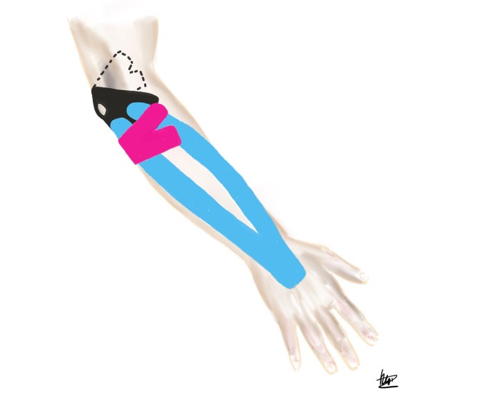 Técnica de corrección fascial (tira rosa) con una banda corta en Y: manteniendo el codo en extensión y el antebrazo en pronación, la punta de la Y se ubica bajo el epicóndilo. Los palos de la Y se dirigen con una dirección horizontal desde el borde lateral del antebrazo hacia el borde medial, aplicando movimientos de oscilación, con una tensión entre el 10% y el 50%.