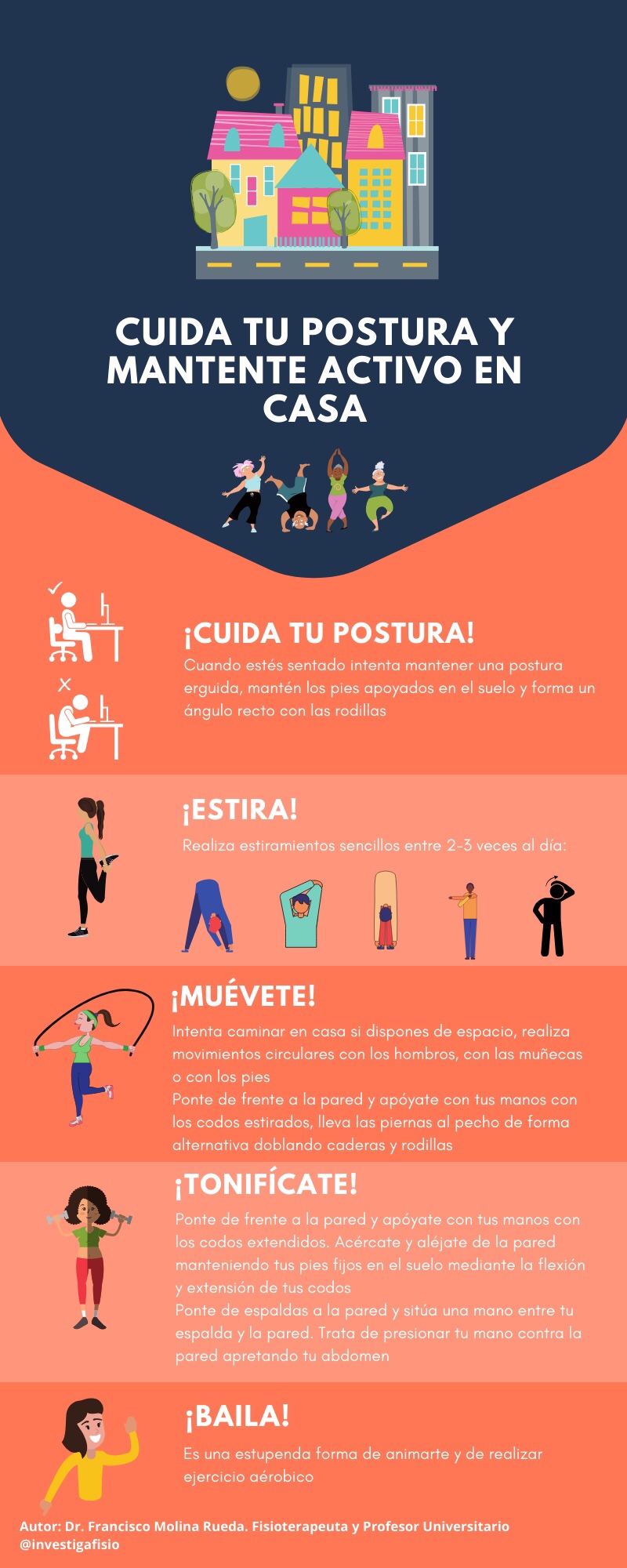 En este periodo de cuarentena es importante mantenerse activo, tonificarse, realizar ejercicios de flexibilización y mantener una higiene postural correcta. Son precisamente los colectivos más vulnerables a esta situación que actualmente vivimos, los que deben cuidar sus músculos y articulaciones con más ahínco. En la siguiente infografía recomiendo algunas pautas. Espero que os guste y la uséis.