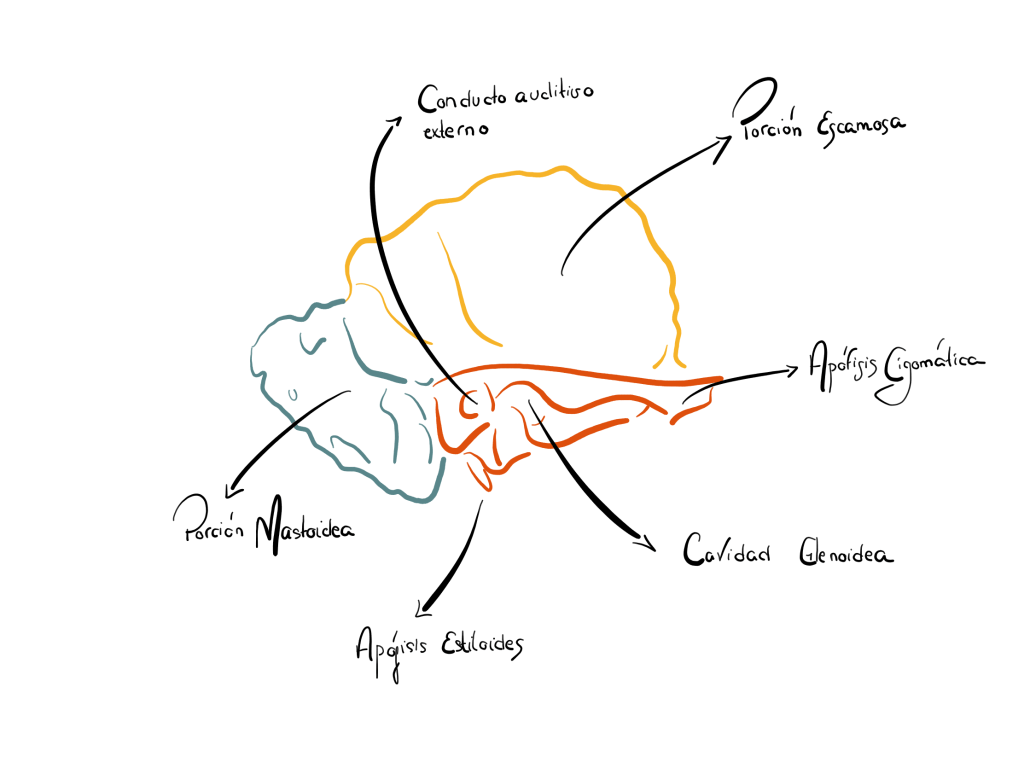 El hueso temporal, uno de los constituyentes de la esfera craneal, es un hueso par localizado en la parte lateral, media e inferior del cráneo. Tiene múltiples relaciones y una estructura bastante peculiar. Se articula con los huesos parietal, esfenoides, malar, occipital y maxilar inferior, a través de la articulación temporomandibular.