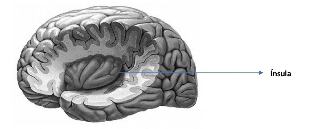 Figura 1. Ínsula. Como su nombre indica, se trata de una isla, un área circunscrita en la cisura de Silvio, no visible en la cara externa del cerebro, al estar cubierta por otras regiones corticales que se superponen. Estas áreas superpuestas se llaman opérculas y forman parte de los lóbulos frontal, parietal y temporal.