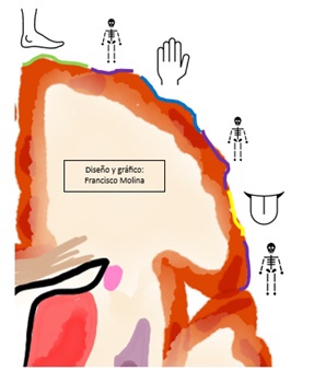 En este sentido, todos recordaréis que, la corteza motora primaria formaba un homúnculo somatotópico continuo que se extendía hacia la circunvolución precentral desde las representaciones del pie hasta la cara. Gordon y cols., que emplearon métodos de resonancia magnética funcional, observaron que, el homúnculo clásico está interrumpido por regiones con distinta conectividad, estructura y función, que se alternan con áreas efectoras específicas (pie, mano y boca) (figura 3).