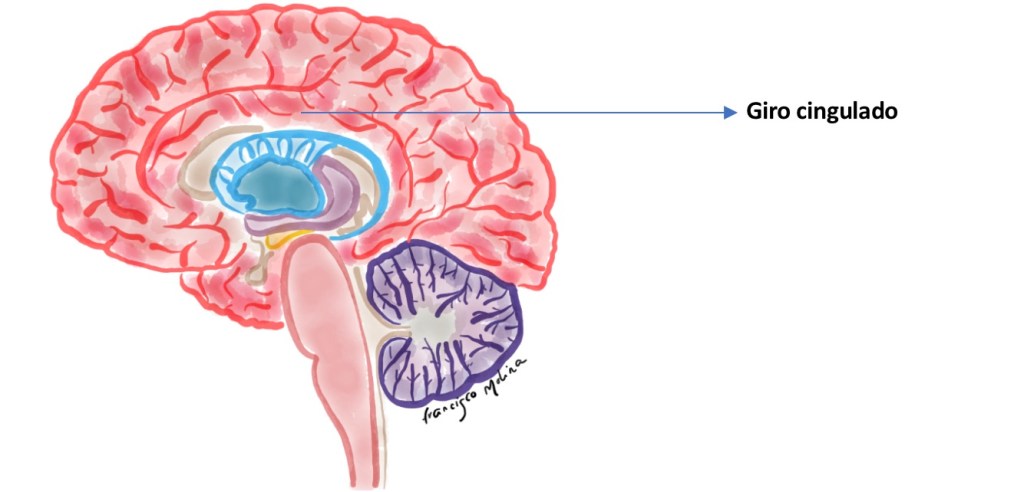 Figura 2. Giro cingulado o córtex cingulado. Localizado en la profundidad de la corteza, próximo al cuerpo calloso.