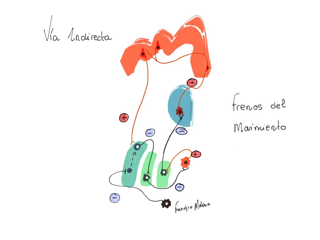 - La vía indirecta inhibe sin control (núcleos subtalámico y globo pálido interno hiperactivos).